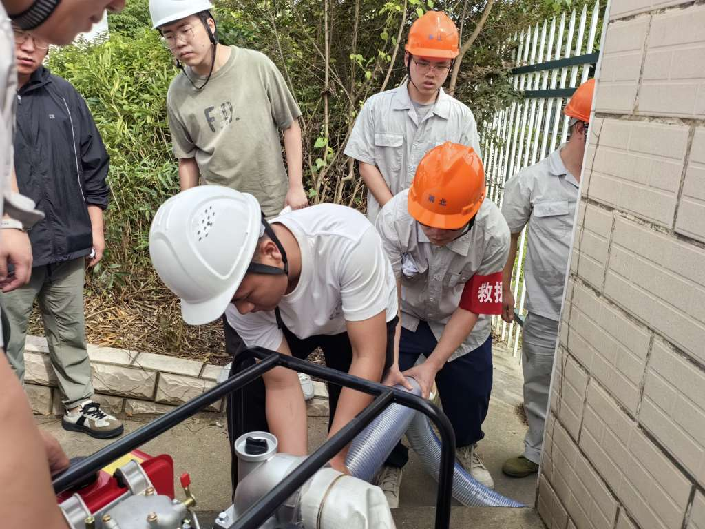 防汛防台演练模拟了台风天气下清排粮站积水情景。面对模拟台风强降雨形成的深积水坑,职工有条不紊地调试好抽水泵后,将粗大的抽水管放进积水坑中,伴随着抽水泵的轰鸣声,积水坑中的积水被快速排空。
